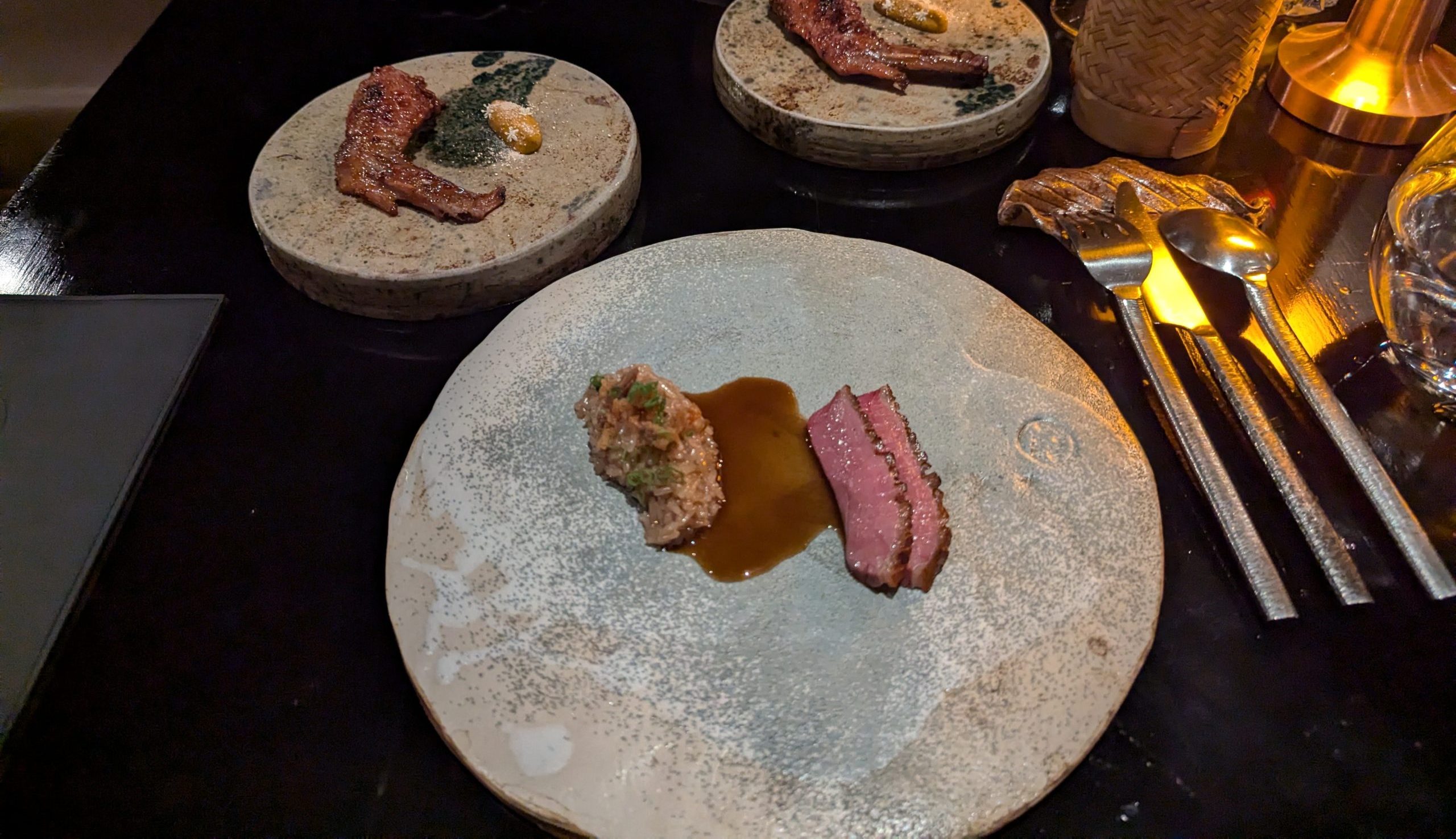 | ・Southern Scallop Curry|Hokkaido Sea Scallop, Betel Leaves ・King Mackerel Rice Porridge|Smoked King Mackerel, Bretagne OysterFermented Bean, Thai Celery ・Muscovy Duck Laab|14-day Dry-Aged Thai Tea Brined Muscovy, Laab Puree, Sticky Rice ・Thai-Prese|Tofu Ice CreamHorapha BasilChiang Mai Tomatoes |